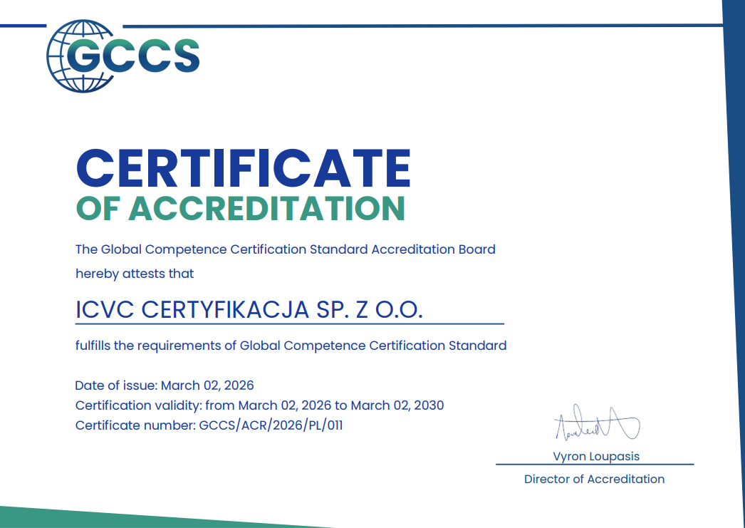 Z przyjemnością informujemy, że w marcu 2026 roku ICVC Certyfikacja uzyskało status oficjalnego akredytowanego partnera Global Competence Certification Standard (GCCS)