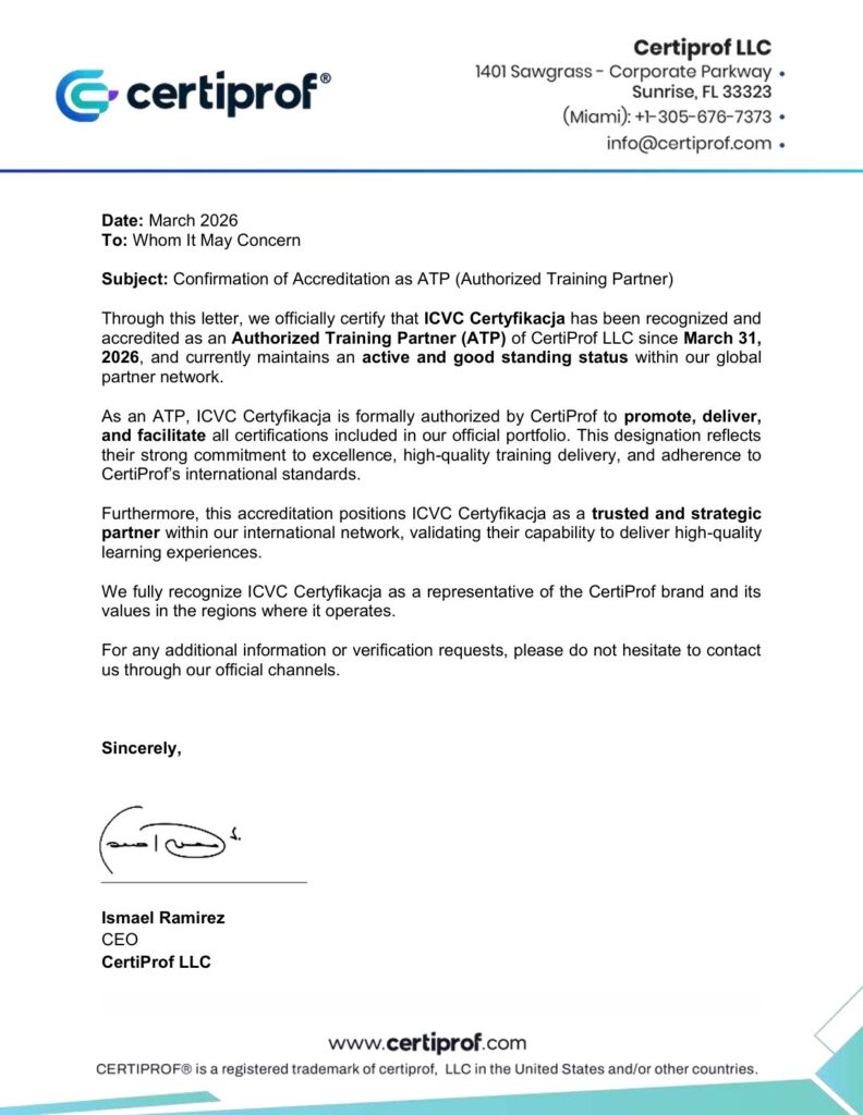 Z przyjemnością informujemy, że 2 kwietnia 2026 roku ICVC Certyfikacja uzyskało oficjalną akredytację CertiProf – uznanej na całym świecie organizacji certyfikacyjnej, działającej od 2010 roku i obecnej w ponad 90 krajach.