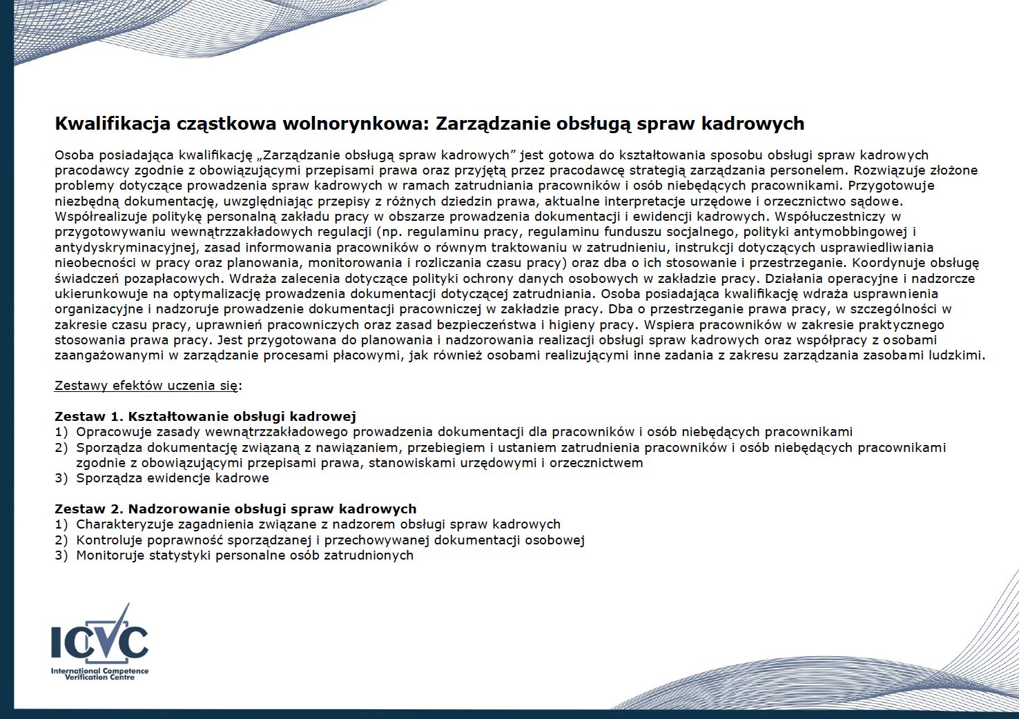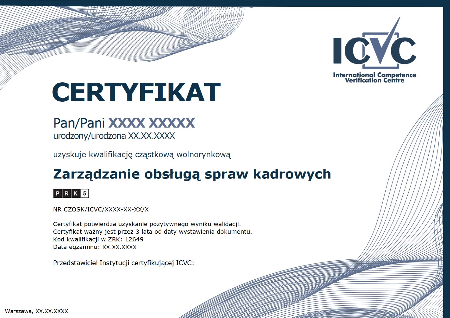 Informujemy, iż powyższy przykładowy wzór certyfikatu jest nową wersją graficzną certyfikatu ICVC, który obowiązuje od dnia 9 lutego 2026 r. (włącznie). Od tej daty nowy wzór będzie stosowany w certyfikatach ICVC potwierdzających nabycie kompetencji oraz uzyskanie kwalifikacji ZSK, wydawanych z datą 09.02.2026 r. i późniejszą. Zmiana ma głównie charakter graficzny – moc i ważność certyfikatu pozostają bez zmian. Nowy wzór certyfikatu nie posiada miejsca na odręczny podpis Egzaminatora ICVC – teraz jednak znajduje się na nim pole na dane identyfikacyjne Egzaminatora (imię i nazwisko). Dotychczasowe certyfikaty, w starej szacie graficznej, zachowują ważność, a ich autentyczność można potwierdzić na podstawie unikatowego numeru certyfikatu za pomocą Wyszukiwarki certyfikatów ICVC . Wzory certyfikatów w starej szacie graficznej są dostępne w Archiwum wzorów .